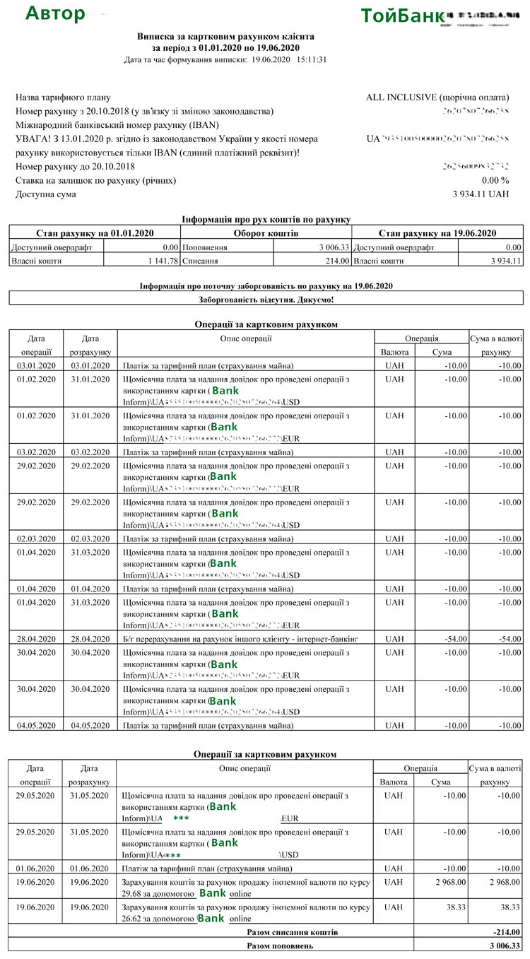 Автор — Банку ТойБанк, надалі Банк Копія, відділенню №*** Банка Вих. № 56 від 23 січня 2021 р. 01 Щодо закриття рахунку 02 23 червня 2020 року я, Автор, надалі Клієнт, направив у відділення №*** АТ "ТойБанк", м. Києва, надалі Банк, заяву, надалі Заява, в якої прямо і недвозначно заявив про припинення договірних стосунків із Банком. Всі картки Клієнта Клієнтом же заблоковано, всі дії Клієнта по рахунку у Банку зупинено. Ніяких стосунків у Клієнта із Банком немає. 03 Посилаючись на Інструкцію "Про порядок відкриття, використання і закриття рахунків у національній та іноземних валютах", затвердженою Постановою Правління Національного банку України від 12.11.2003 №492, Банк стверджує, що даних, вказаних в Заяві, недостатньо для закриття рахунків Клієнта. 04 Направляю в вашу адресу копію Картки фізичної особи — платника податків, наданої ДПІ у Шевченківському районі м. Києва — Додаток 1. Ідентифікаційний номер Клієнта — ***. Дата видачі довідки 08.02.2005 р. Копія завірено особистим підписом Клієнта 23.01.2021 р. 05 Також Банк повідомляє про наявність нібито заборгованості Клієнта перед Банком. 06 В листі Банку Вих. №11/118645 від 18.09.2020 р. стверджується, цитуємо: "Станом на дату надання відповіді за рахунком UA79 Рах 1 обліковується заборгованість в розмірі 10 грн за надану послугу "Star Inform" по рахунку UA Рах 2 за червень 2020 року та платіж в розмірі 10 грн за страхування майна." Кінець цитати. 07 Направляю в вашу адресу Додаток 2, далі Виписка — цей документ — "Виписка за картковим рахунком клієнта за період з 01.01.2020 по 19.06.2020, Дата та час формування виписки: 19.06.2020 15:11:31." 08 Згідно Виписки залишок на рахунку Клієнта — 3934,11 грн. (прописом три тисячі дев’ятсот тридцять чотири гривни 11 копійок). 09 Направляю в вашу адресу Додаток 3, далі Квитанція — цей документ — "Квитанція на придбання товару на суму 3924,11 грн. (прописом три тисячі дев’ятсот двадцять чотири гривни 11 копійок) від 19.06.2020 р." 10 Таким чином, як слід з наведених документів, залишок на рахунку Клієнта станом на двадцять чотири години нуль-нуль хвилин дев’ятнадцятого червня 2020 року складає 10 (десять грн.), які мають біти списані Банком як платіж за використання послуг системи BankInform. 11 Згідно Виписки згаданий Банком платіж за страхування майна за червень, нібито заборгований Клієнтом, здійснено Клієнтом (автоматично списаний Банком з рахунку Клієнта) 01.06.2020 р. 12 Таким чином, заборгованість, що має місце за листом Банка, яка обліковується за рахунком UA Рах 1 в розмірі 10 грн. за надану послугу "BankInform", була повинна бути списаної за рахунок залишку на рахунку у розмірі 10 грн. (прописом десять гривен, 00 копійок). 13 З вищенаведеного випливає, що у Клієнта немає заборгованості перед Банком за даними Банка и перешкод щодо закриття рахунку немає. 14 Однак Клієнт змушений звернути увагу працівників Банка на недостовірність наданих Банком даних у вищенаведеної цитаті. 15 Як слід з виписки і що не знайшло відображення у наведеної цитаті, першу половину 2020 року Банк щомісяця двічі списував з рахунку Клієнта щомісячну плату за надання довідок про проведені операції з використанням карток (BankInform). Перше — за доларову картку — UA Рах 2 \USD, вдруге — за євро картку — UA Рах 3\EUR. 16 Тобто, можливо, Клієнт винен десять грн. за проведення операції з використанням картки (BankInform) за одної з цих карток. 17 В черговий раз прошу надати мені, Клієнтові, виписку Банка щодо руху ко